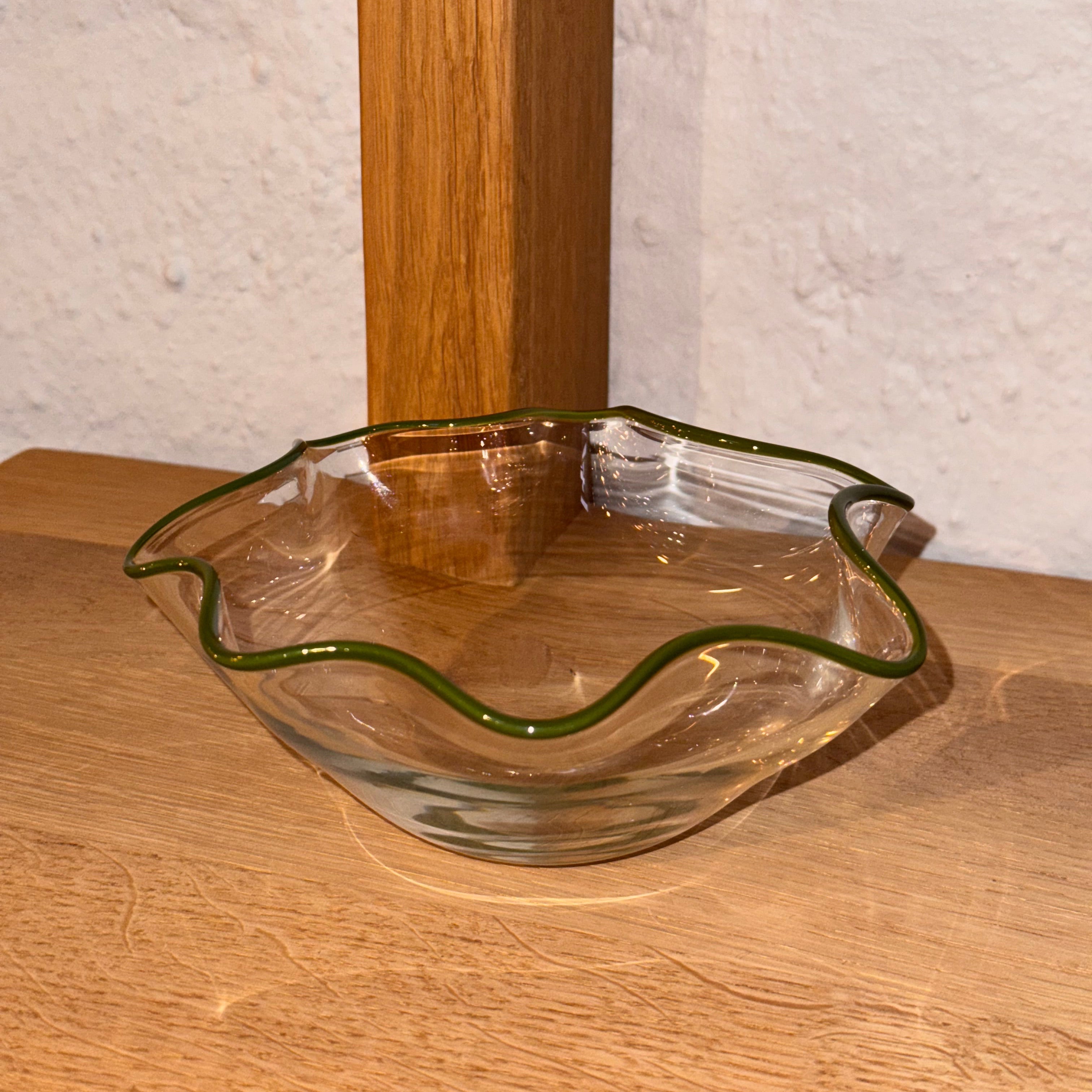 Elegant håndlavet glasskål med bløde, bølgende kanter, der giver et frisk og naturligt udtryk. Skålen kombinerer enkelthed med et kunstnerisk præg og passer perfekt til både hverdagsbrug og særlige anledninger.