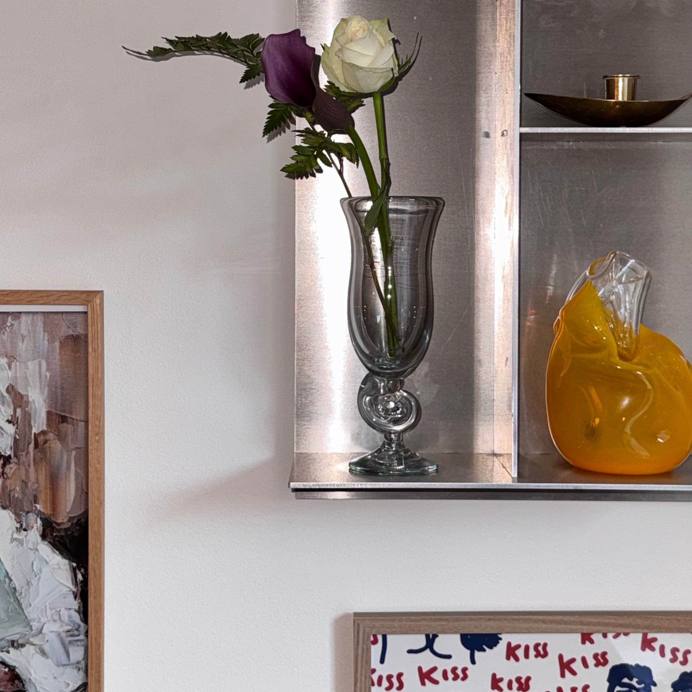 Elegant glasvase med klassisk form og detaljeret fod. Vasen er mundblæst og har en smuk, svungen silhuet, der gør den ideel til både enkle blomsterstilke og mindre buketter. Den dekorative fod giver vasen et skulpturelt udtryk, som også gør den velegnet som en dekorationsgenstand i sig selv.