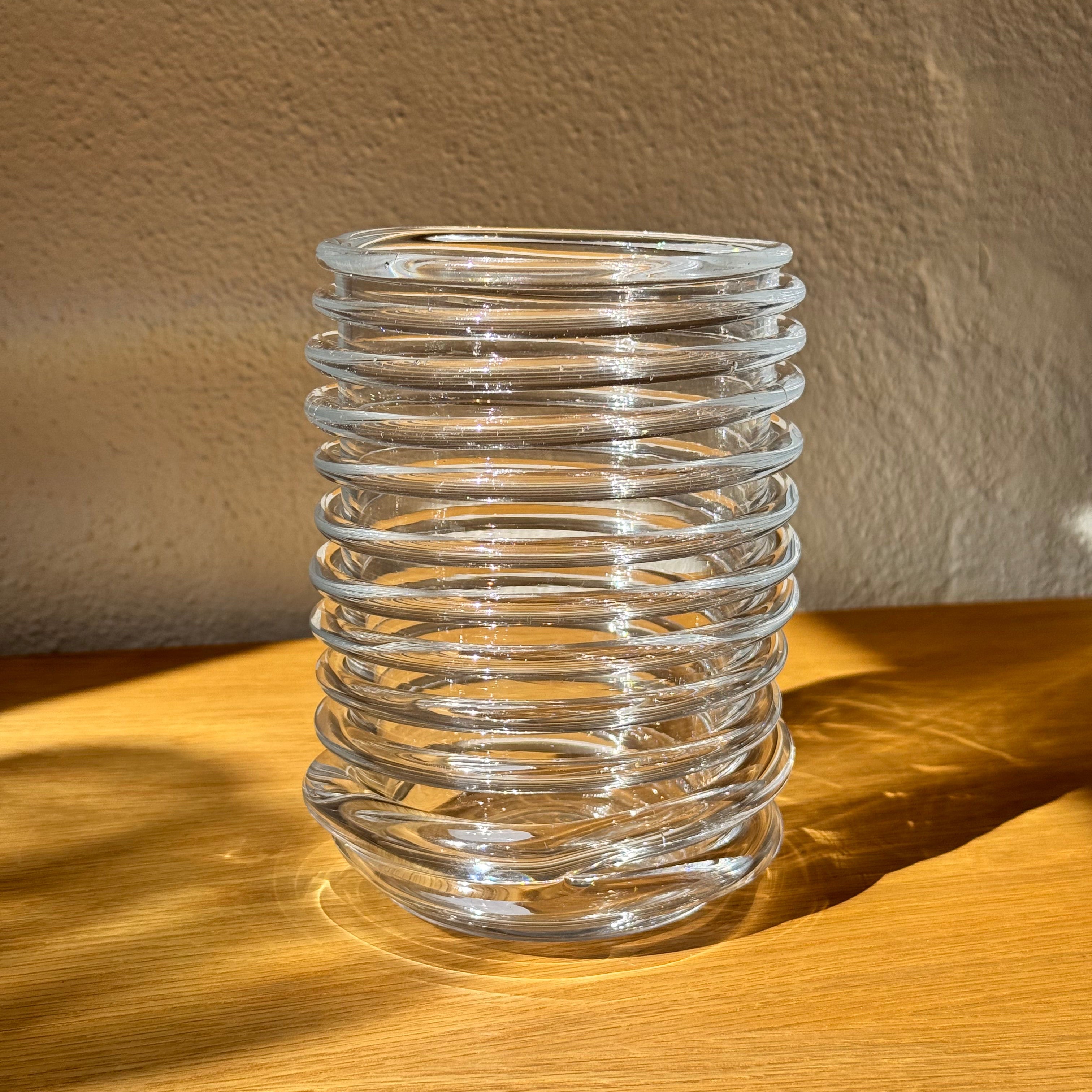Det multifunktionelle design gør den ideel både som vase til en lille buket eller enkelte stilke – og som lysholder til et stort bloklys, hvor spiralformen skaber et magisk spil af skygger.